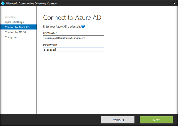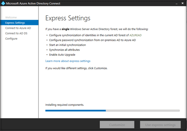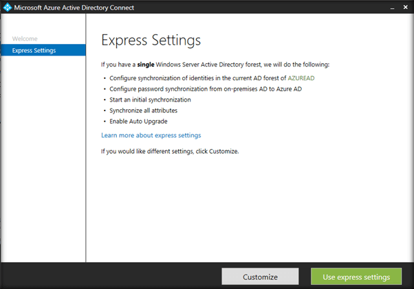 - We can continue with Express settings, if we want to use Azure AD Connect to synchronize the directories (On Premise with Office 365 along with Password Synchronization.