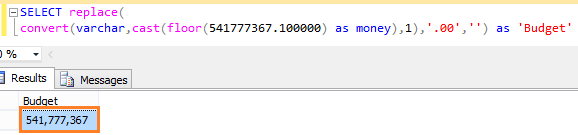 - SELECT replace(convert(varchar,cast(floor(541777367.100000) as money),1), '.00', '') as 'Budget'
