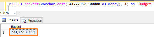 - SELECT convert(varchar,cast(541777367.100000 as money), 1) as 'Budget'.