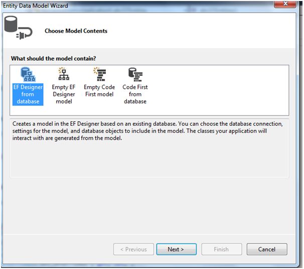 Now go to your application and Right click on solution explorer and add a “ADO.Net Entity Data Modal” and select database first approach.