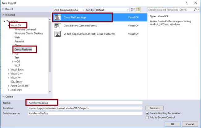 Open Visual Studio 2017 RC -> Start -> New Project-> Select Cross-Platform (under Visual C#->Cross Platform App-> Give the suitable name for your app (XamFormGesTap) ->OK.