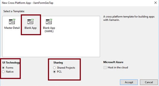 Step 2Select the Cross Platform template as Blank app ->Set UI Technology as Forms and sharing as PCL. Afterwards, Visual Studio creates 4 projects (Portable, Droid, iOS, UWP) and displays Getting Started.XamarinPage.