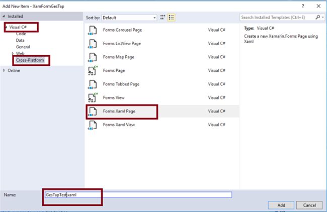 Select ->CrossPlatform-> FormXamlPage-> Give the relevant name (GesTapTest.Xaml).