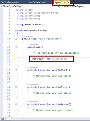 Open (double click) the file App.cs in the Solution Explorer-> XamFormGesTap(portable) and set the Root page.
