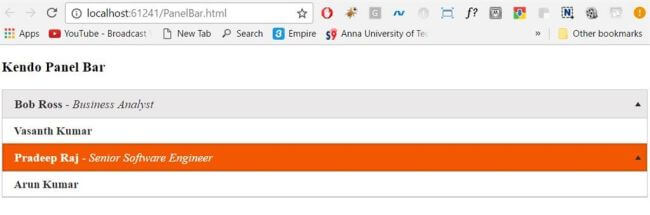 From the above code, you can observe that the template property is used while defining the kendo panel bar. The template is decorated/customized in the way which is used to display the firstname and lastname of the employee with his designation.