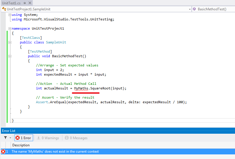 First write test method and then develop the coding for application logic, Test method implemented, actual Class not implemented, Error generated.