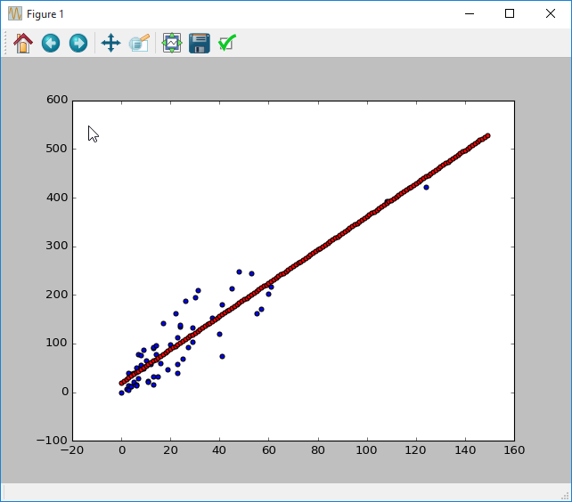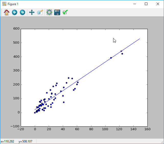 And then, we have to set X and Y value by using x = data[“X”] and y = data[“Y”] and then, transform arrays as matrix. Fitting columns is another important step. Polyfit function will be good method for fitting X and Y values. And preparing data by using np.arange() function will produce 150 items. And then running code will create below plot.