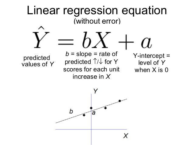 A linear regression line has an equation of the form Y = b*X+a, where X is the explanatory variable and Y is the dependent variable.The slope of the line is b, and “a” is the intercept.