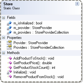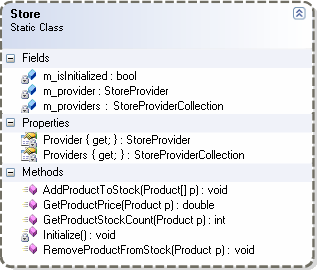 It takes a bit to wrap one's mind around the basic structure, but once you see how requests are executed against the static Store class and then passed to a reference of a StoreProvider which is implemented by a CornerStoreProvider, you get the basic idea of how the cogs of this machine all work together.
