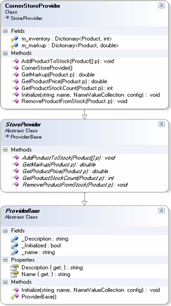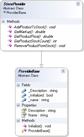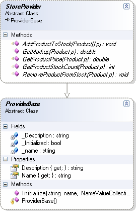 In our application we'll call the Application Provider Base "StoreProvider". Notice how the Store Provider class has abstract definitions for the methods defined in the Store class and inherits from the abstract class ProviderBase.