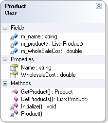 This class is not part of the provider pattern, however, we are using it to move data back and forth. We are defining the name and the wholesale cost for each product. Each store will have it's own markup on each product so we can calculate the retail cost. I have also added static methods to get all available products: GetProducts() and Initialize().