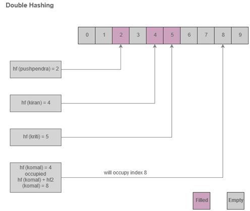 In this, two different hashing functions are used. If the first hash function hf (key) is occupied, then the second hash function hf1 (key) is used to increment the result of first hash function. E.g.