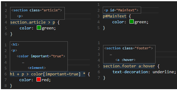 CSS selectors precede any CSS clause. They define what HTML elements to style with the subsequent properties. Selectors can become pretty complicated – and be it because sometimes you just might not be too familiar with one of them that you are using less frequently. Visual Studio Code solves this problem by presenting a preview for the current selector that shows what HTML elements would have to be like to be covered by the selector.