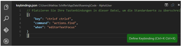Just like Visual Studio, Visual Studio Code supports keyboard shortcut chords: The editor is awaiting a second keyboard shortcut after the first keyboard shortcut has been entered. This allows for grouping of similar commands. As an example, you could change the search in a file from Ctrl+F to Ctrl+F Ctrl+F and the global search in all files to Ctrl+F Ctrl+G. In keybindings.json, the keyboard shortcuts for the chord must be separated using a blank space.