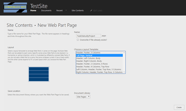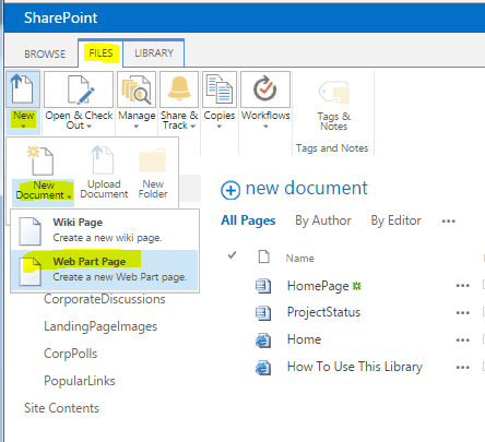 Now, select the "Files" tab from the top ribbon, select the down arrow and then "New Document". Finally, select the "Web Part Page".