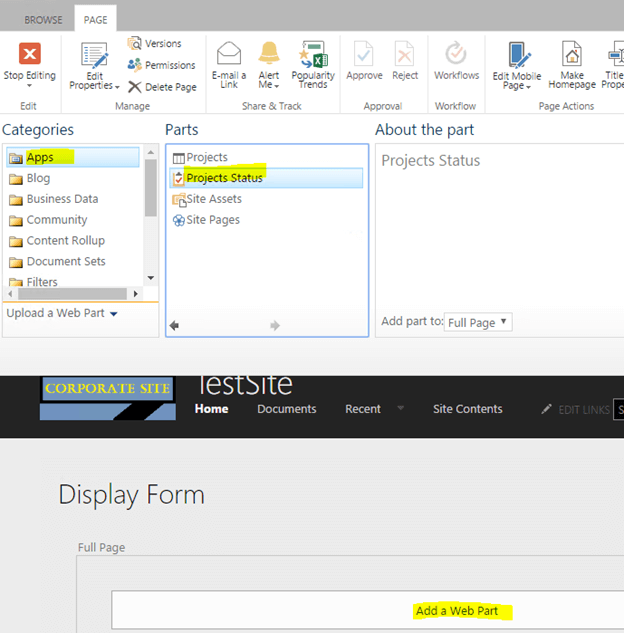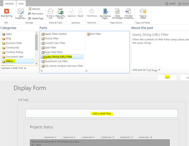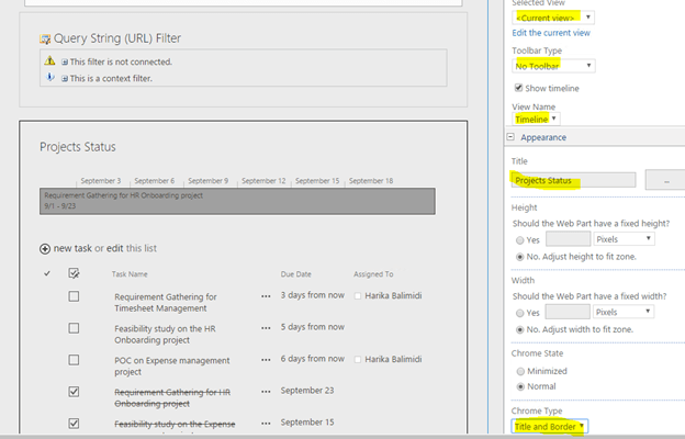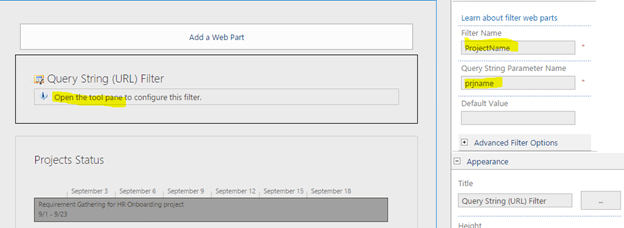 Here, in the example, given below, I am going to use Projects Status list and a list view in "TaskStatusByProjects" page. The Project list view is used, which will show the different tasks, based on the project name mentioned in the query string.