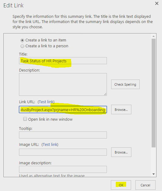 In the home page, I have a few links in the Summary Links sections. Now, I can provide the links with the query string, so that when the user clicks the link, it will directly open the page, shown above with the respective query string to show the Task Status accordingly.