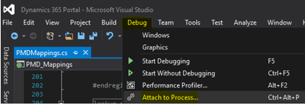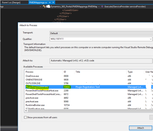 Go to Visual Studio and attach the process “PluginRegistration.exe”.