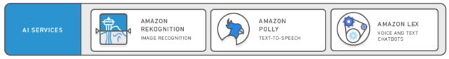 Amazon AI consists of three services – Lex, Polly, and Rekognition.