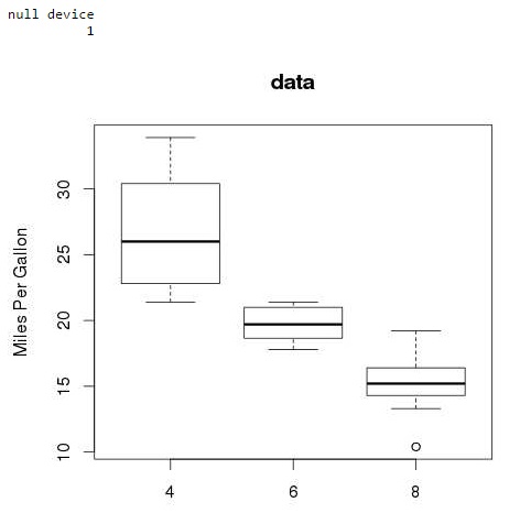 - boxplot(mpg ~ cyl, data = mtcars, xlab = "Number of Cylinders",