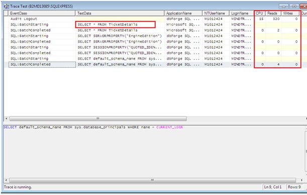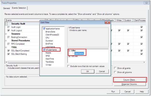 1. Access SQL Profiler: Go to SQL Server, Performance Tools, then SQL Server Profiler. 2. TRACE: Create new Trace. 3. Connect to Database using Credentials, 4. Trace Properties: Here are the properties of Trace. Specify the Trace Name & Template: 5. Event Selection settings, 6. Column Filter: Use Column Filter option to trace what all type of query needs to be traced and also from which user the transactions need to be traced. I selected the User level [DB Username] level tracking. 7. Execute: Click “RUN”, Trace is ready to track all the transaction details. 8. Query Execution: Connect to database and execute the query 9. Trace Details 10. Save Trace Records: Save the Trace File for future analysis.