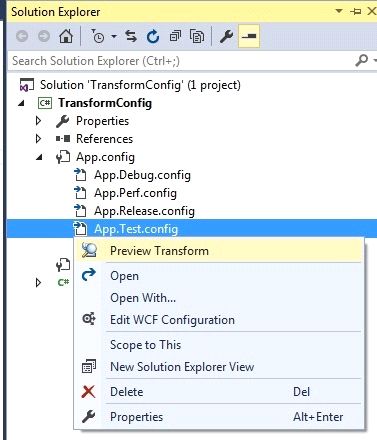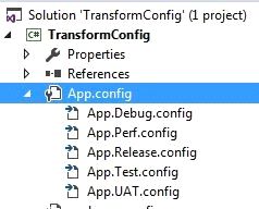The Add Transform will add the available configuration environment app.config (like for Test the config file will be added as App.Test,Config) files under the "App.config"