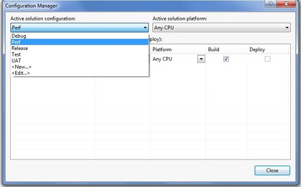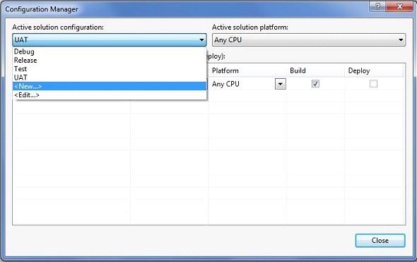 Step 2: Select the option <New> from the drop down "Active Solution Configuration" to add a new environment configuration.