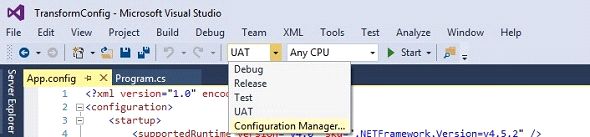 To demonstrate this I have created a console application which will transform config using slow cheetah. I have followed the above steps and added the three Configuration environments "Perf","Test" and "UAT". And based on the configuration environment selected in my demo the url value gets changed.