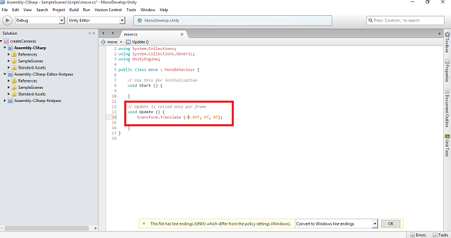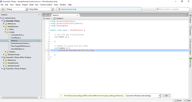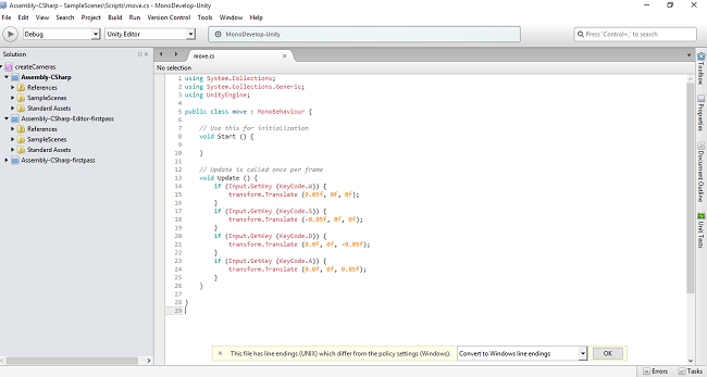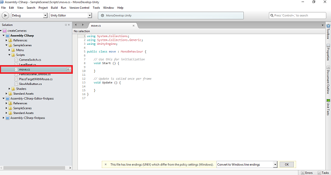 Double click on the move script. The MonoDevelop-Unity editor will open up.
