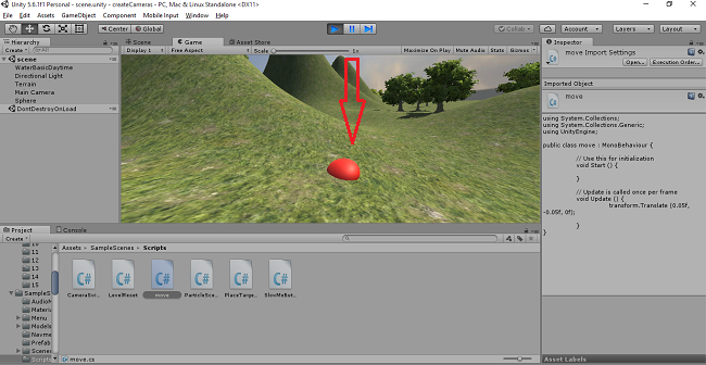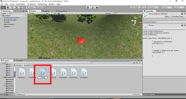 Go back to the Unity window. Drag and drop the move script onto the sphere.