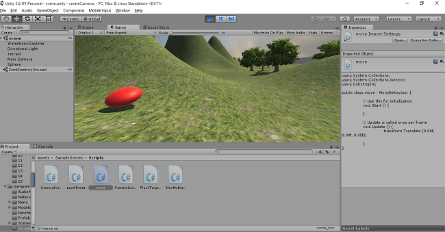 Save the program. Go to Unity and click on the Play button. The sphere will be moving slowly to the right.