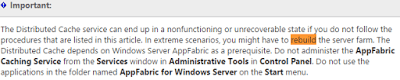 Do not restart the AppFabric Caching in the services console. Microsoft strongly recommends this and if you do this, you might need to rebuild your farm.