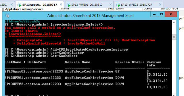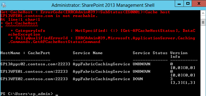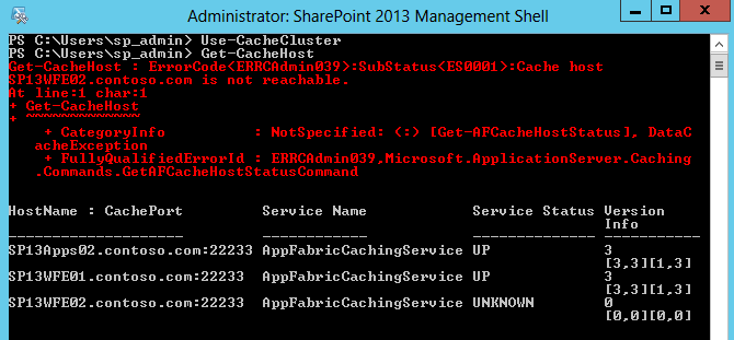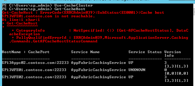 Error: SubStatus(ES0001): Cache host SP13WFE01.contoso.com is not reachable. Error: SubStatus(ES0001): Cache host SP13WFE02.contoso.com is not reachable.