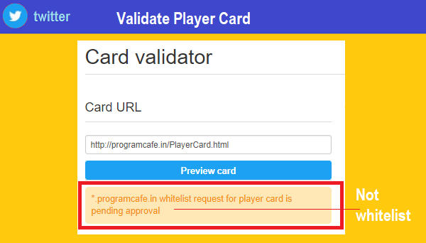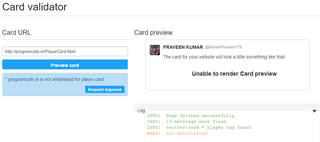 http://programcafe.in/PlayerCard.html is the url of my PlayerCard page. Let's paste this url into twitter card validator.