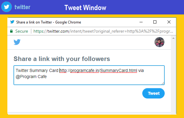 Summary card is a kind of twitter card which allows us to show an image with our tweets. Basically, it is designed to give the reader a preview of the content before clicking through to your website.