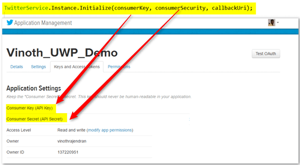 - TwitterService.Instance.Initialize(consumerKey, consumerSecurity, callbackUri);