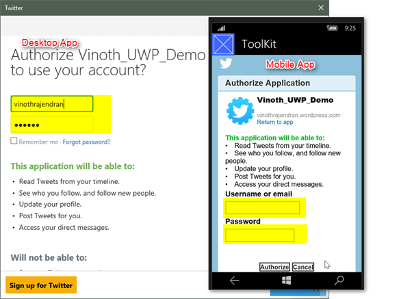 TwitterService.Instance.Initialize function is used to the request to the user for giving the permission to access the Twitter account (username and password must be entered) like the below image.