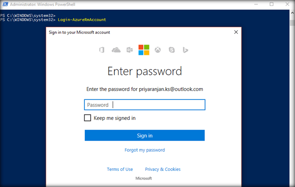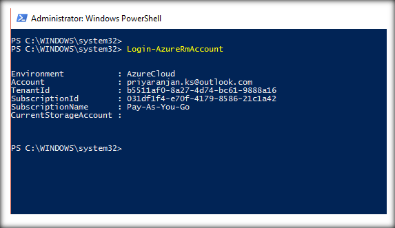 Once the installation completes spin up Windows PowerShell, add the command given below to connect to Azure Subscription.