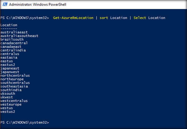 Resource group acts as a container for all the resources. In order to create the resource group, we need to specify the location for the resources. We can get the available set of resources by running the script given below.