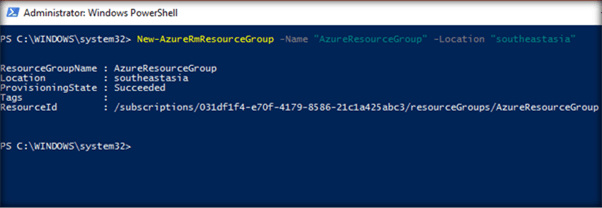 New-AzureRmResourceGroup -Name "AzureResourceGroup" -Location "southeastasia".