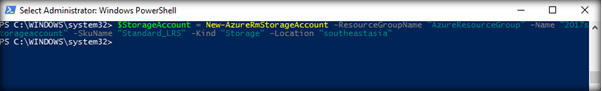 $StorageAccount = New-AzureRmStorageAccount -ResourceGroupName "AzureResourceGroup" -Name "2017storageaccount" -SkuName "Standard_LRS" -Kind "Storage" -Location "southeastasia"