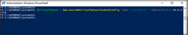 $VirtualSubnet = New-AzureRmVirtualNetworkSubnetConfig -Name "2017Subnet" -AddressPrefix 10.0.0.0/16