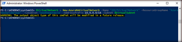 $VirtualNetwork = New-AzureRmVirtualNetwork -Name "2017VirtualNetwork" -ResourceGroupName "AzureResourceGroup" -Location "southeastasia" -AddressPrefix 10.0.0.0/16 -Subnet $VirtualSubnet