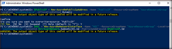 $NIC = New-AzureRmNetworkInterface -Name "NIC" -ResourceGroupName "AzureResourceGroup" -Location "southeastasia" -SubnetId $VirtualNetwork.Subnets[0].Id -PublicIpAddressId $PublicIP.Id