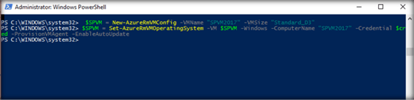 $SPVM = New-AzureRmVMConfig -VMName "SPVM2017" -VMSize "Standard_D3"
