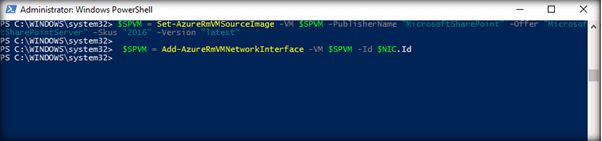 $SPVM = Add-AzureRmVMNetworkInterface -VM $SPVM -Id $NIC.Id