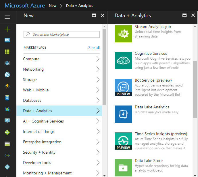 - Open the Azure portal and click on Add >> “Data + Analytics”.