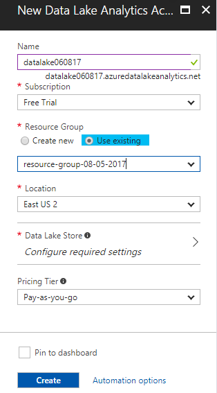 - Implementation – Create a Data Lake Analytics account