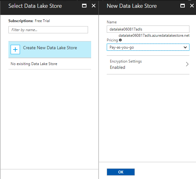 - Also, before that, we need to create “Data Lake Store” and click on the "OK" button.
