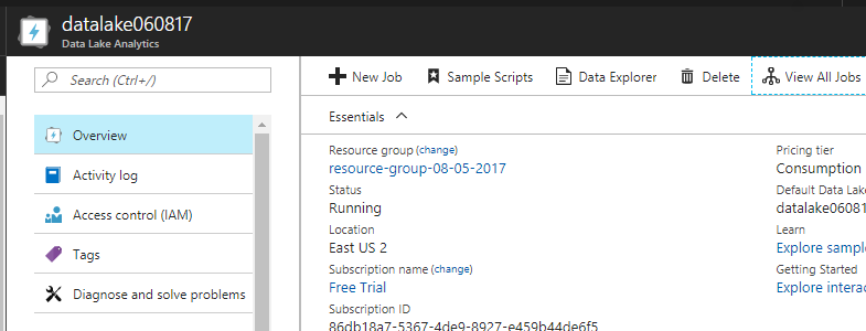 - See the Data Lake Analytics section for the newly created “data-lake060817”.